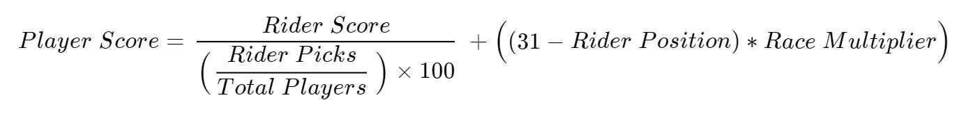 Scores are calculated by dividing the number of points a rider earned by the percentage of the users who picked them. A bonus is awarded for rare picks.
